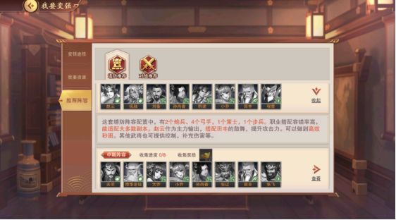 阵容推荐:将根据全服主公在塔防及对战使用率最高的武将进行阵容推荐。