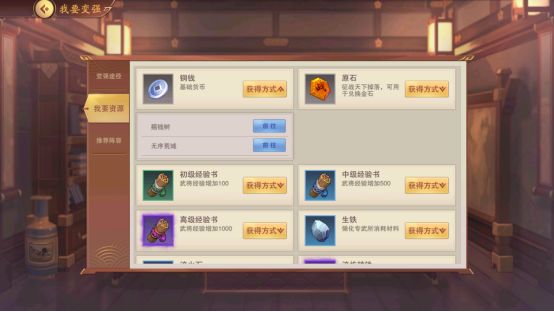 变强指引分为“变强途径”、“我要资源”及“推荐阵容”。主公可根据自己目前的需求查看不同指引。