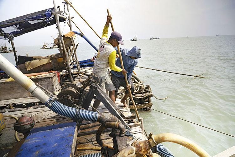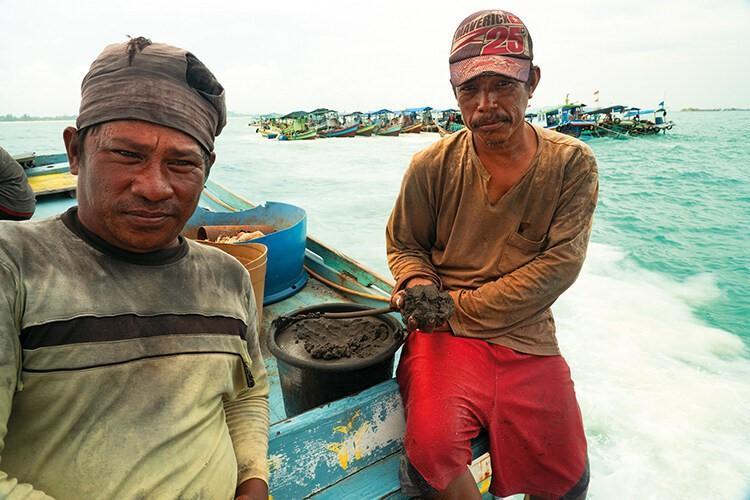 工人每天要花至少十个小时从海底抽沙来提取锡矿