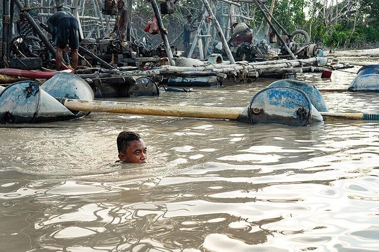 由竹子和回收材料制成的临时木筏最多可搭载三名矿工。一位矿工说:“这个地区被称为千筏滩。这里的锡含量非常丰富,有时候一天能提取十公斤。” 矿工会以每公斤45英镑的价格出售这些锡矿。锡是一种需求量很大的商品——它被用作许多电子产品的焊料,每部智能手机都含有几克锡。印度尼西亚是仅次于中国的世界第二大锡矿生产国,其中90%来自邦加岛及其邻居勿里洞岛。