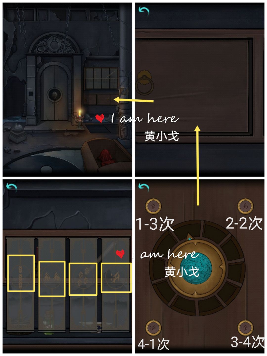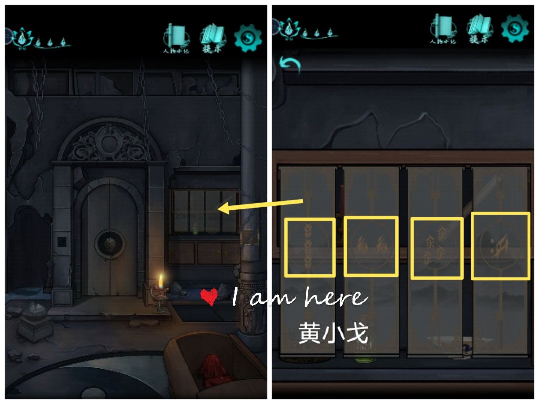6.点击柜子,打开,根据纱帘上的线索,点击柜子上的机关(左上角图案按钮按三次、右上角按钮按两次、右下角按钮按四次、左下角按钮按一次),打开石柱上的铁链
