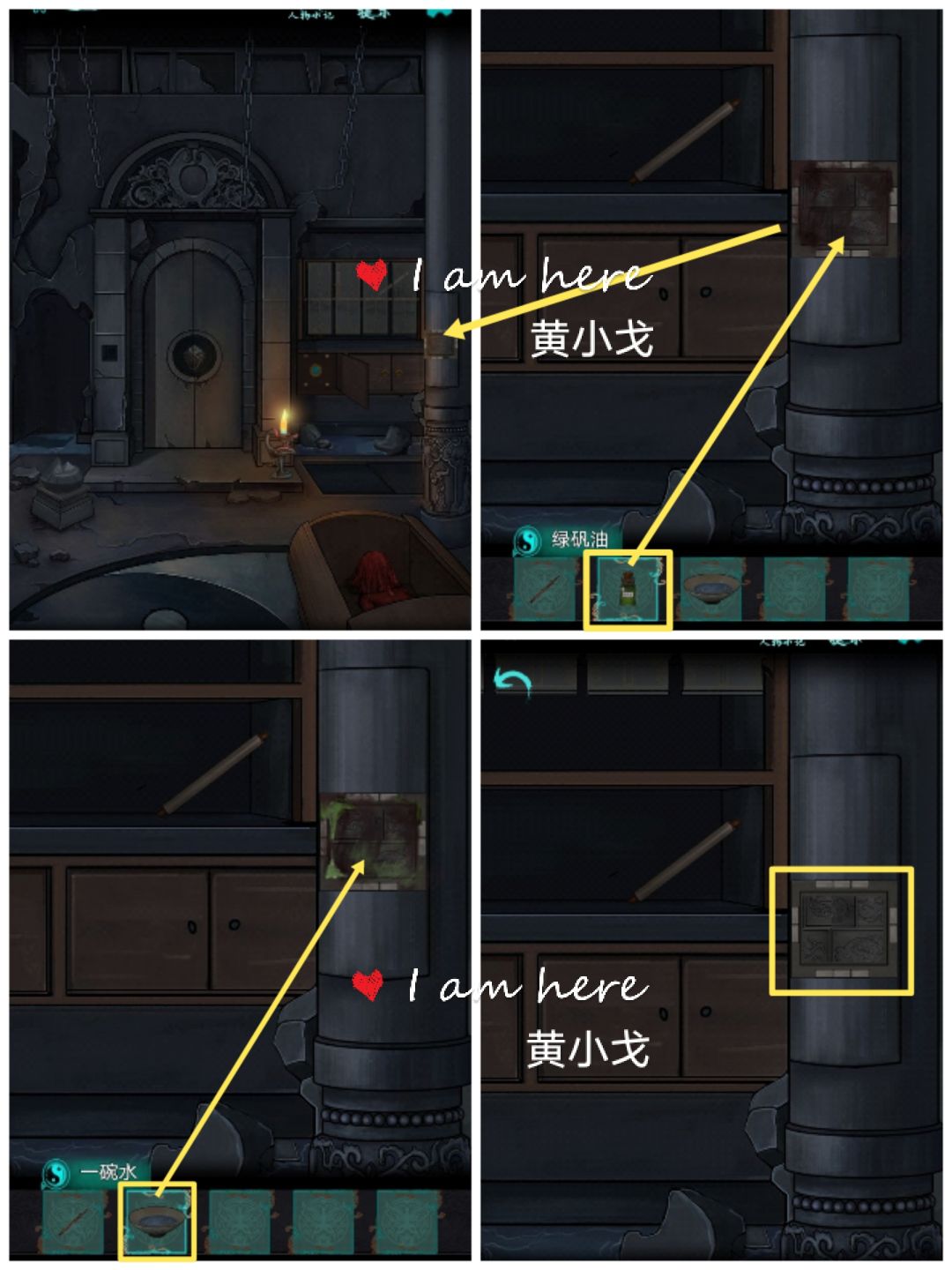 7.点击石柱,用【绿矾油】除掉机关上面的铁锈,用【一碗水】冲洗,点击机关