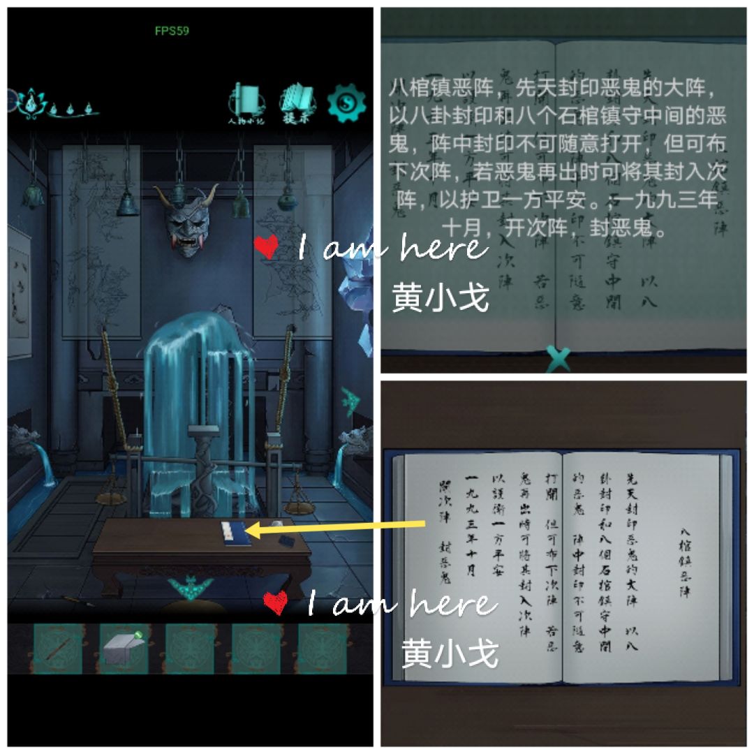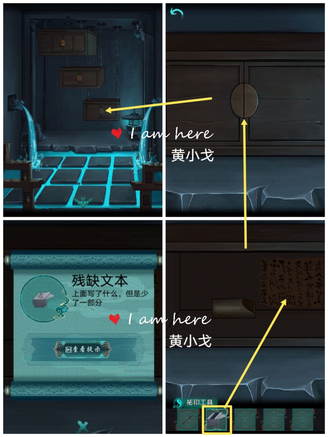 15.(坤门内-右)点击下边的柜子,打开,用【拓印工具】拓柜壁上的字,获得【残缺文本】