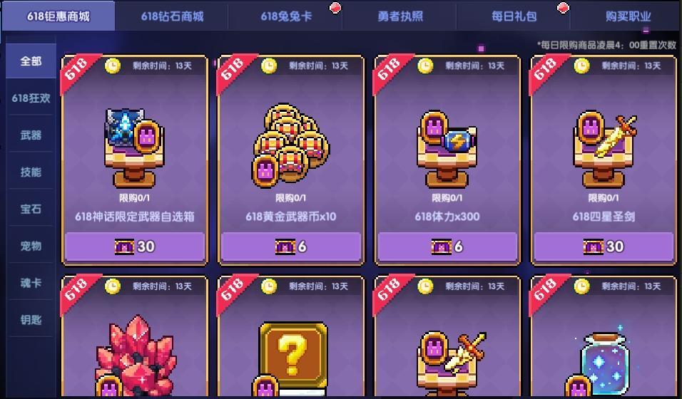 上架礼包:黄金武器币十连、觉醒石礼包、618限定4属性魂卡包、魔神石自选大礼包、魂卡重置券等