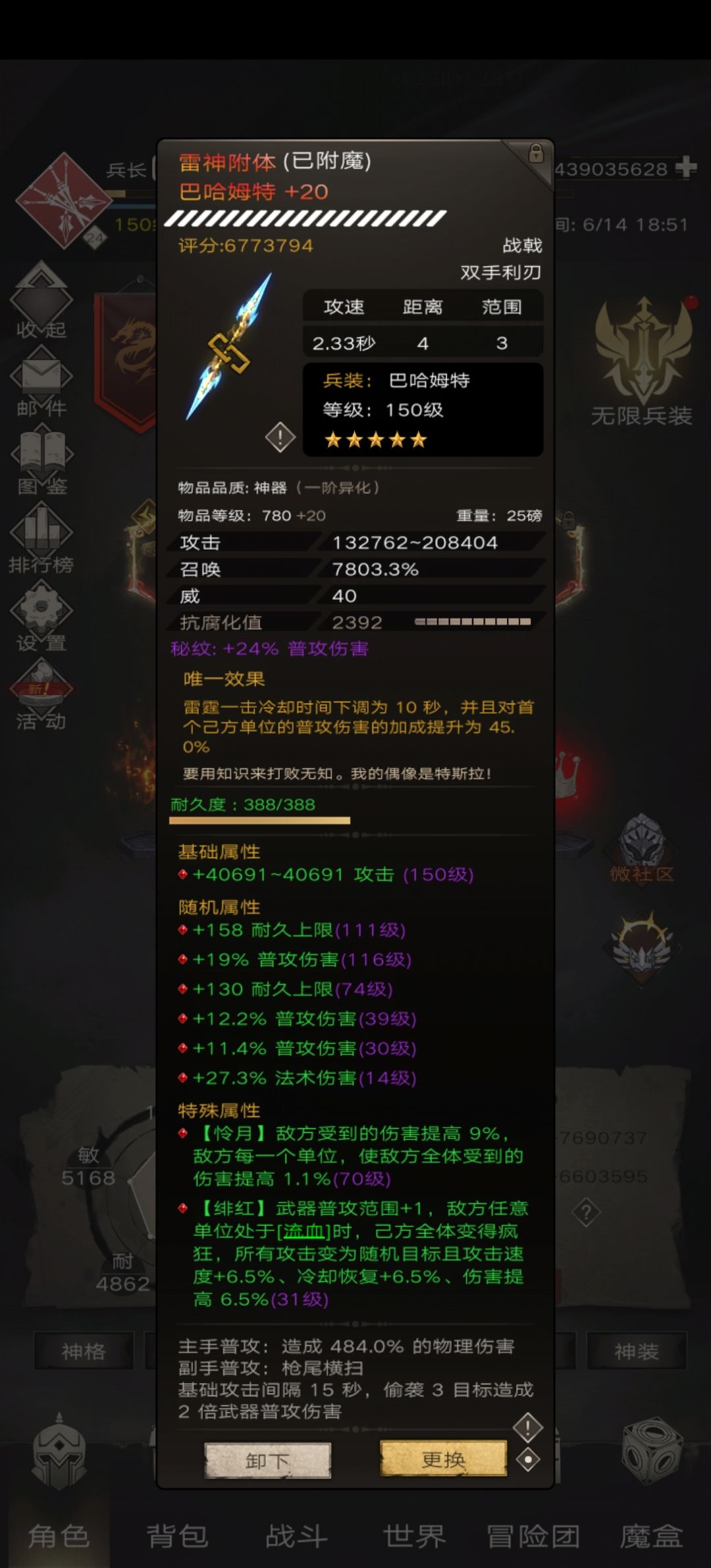 可见,神器上限极高,提升到一定程度比起原来的顶级六红腐化武器要高的多,当然这需要得到以下高收益词条的支撑,比如耐久、普攻、伤害、全伤、法伤等。