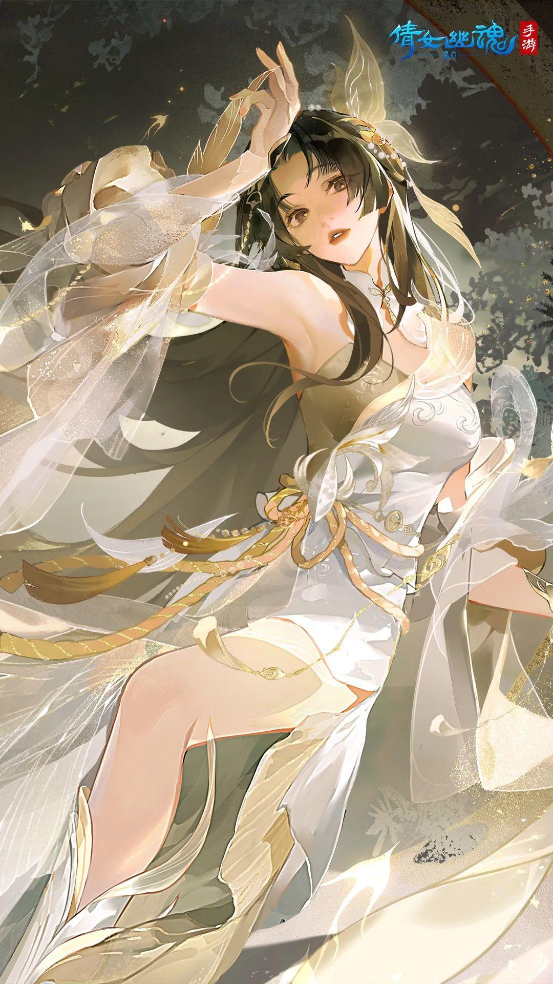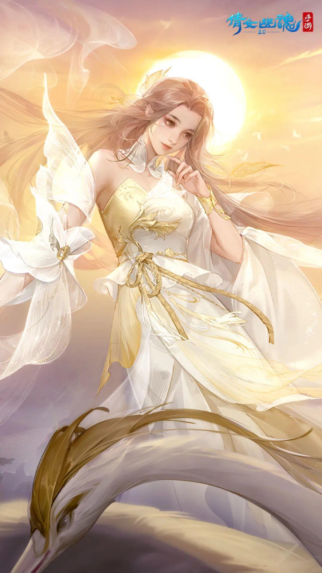 长空之上,有神鸟翱翔天际。更有佳人一对,凝眸对望,似有情丝,身后旭光万丈,如天神临世,浮金点点缀在衣上,美绝妙绝。