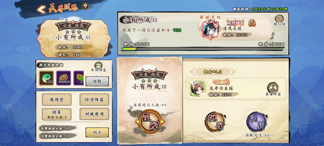 六界王座 和三界是轮流来的 可以去找人少的打前三去 因为给的奖励很好 又有勾玉 又可以换家具