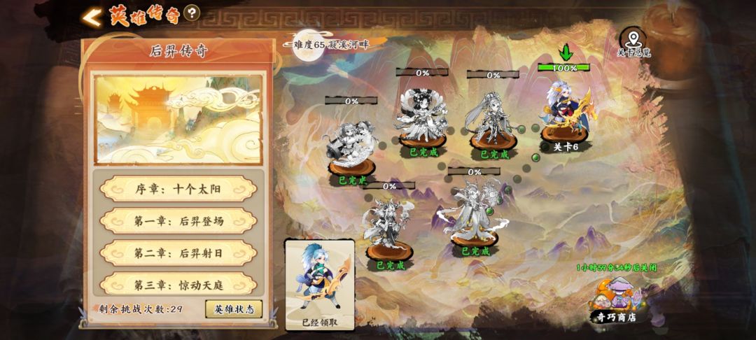 后羿传奇每天打一下会出商店 里面价格都是低于平时商店的 最好每天打一次 后羿诸葛亮李师师关卡到50关都会送一个本体 萌新可以多加几个等级高的好友用好友援助