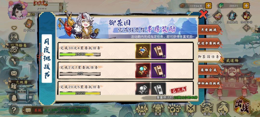 月度挑战都要做完 可以拿火羽 火羽可以换宠物龙 神器之类的 除了7星任务其他平时做做都可以做完 7星任务3000勾玉刷新必出一个