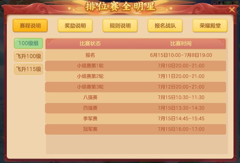 6月15日维护后,100级组、飞升100级组、飞升115级组赛事将开启报名,报名阶段持续到7月8日。满足报名条件的玩家可组成5人队伍前往明月城(86,154)的铭星处报名参赛,赛事允许跨服组队