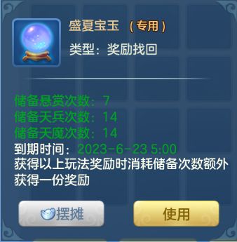 1)盛夏宝玉6月15日维护后-6月22日5:00,等级≥40级的少侠登录即可获得盛夏宝玉,在进行天兵、天魔、悬赏任务时能获得双倍奖励(盛夏宝玉仅活动周期内有效)