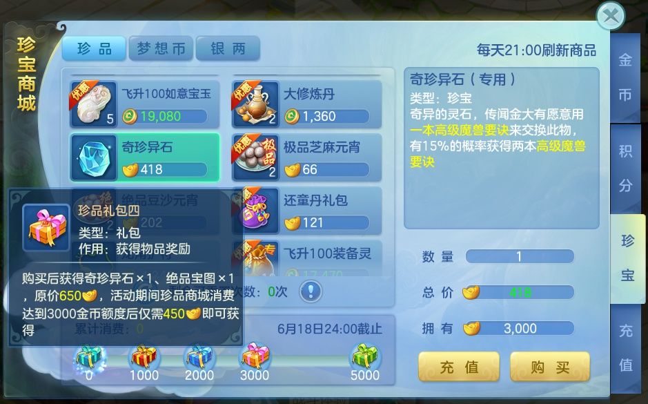 6月15日维护后-6月18日24:00,可通过活跃度获得珍品商城折扣券和重置券,珍品商城消费达到一定额度可优惠购买珍品礼包