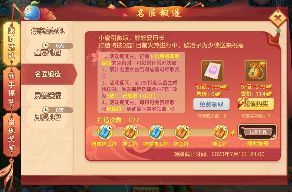2)活动期间,名匠锻造界面,每日登录还可领取神铸符,提高双属性概率和减免打造消耗,最多可领取7张