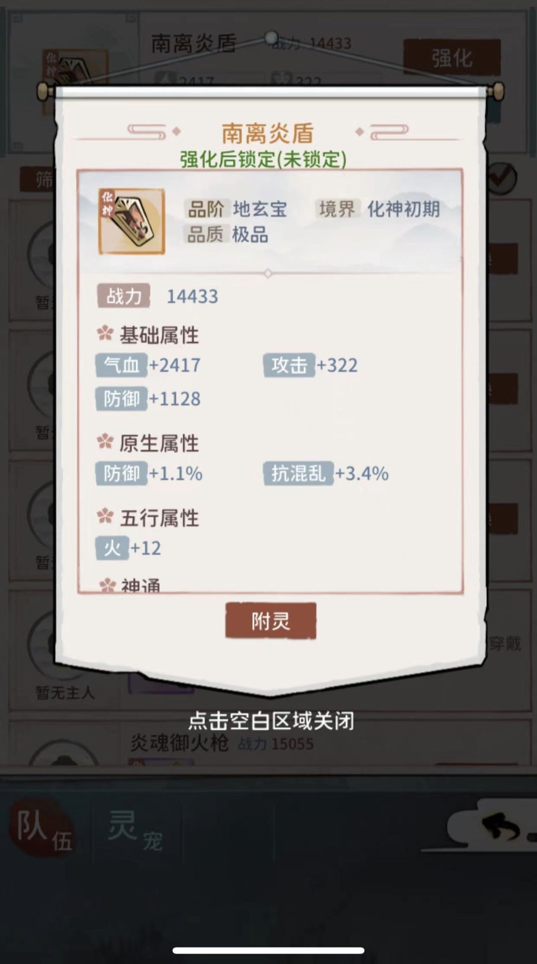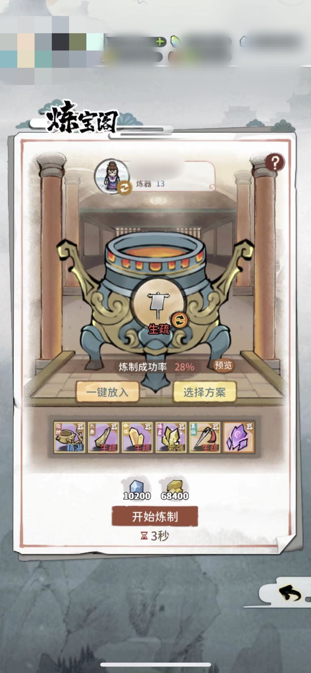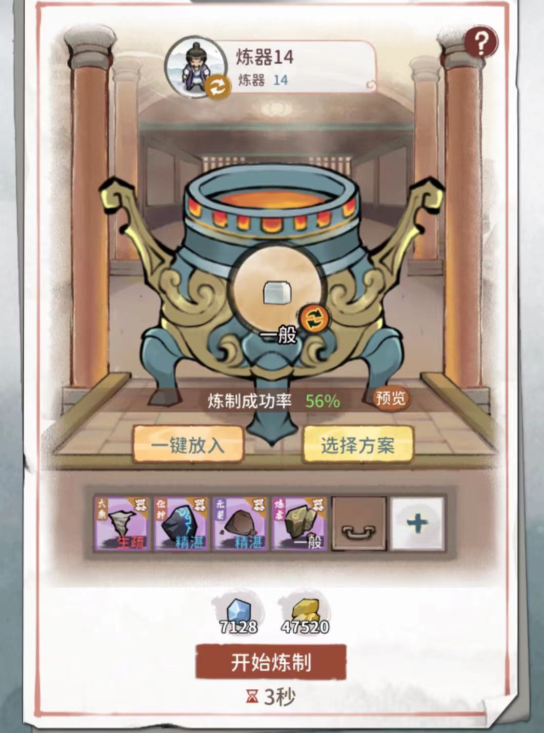 接下来就是3压,用炼器13弟子,合体器胚,4个+5属性的稀有材料再加一个其他属性稀有材料,再加一个隐息-1,有很低的概率炼制出化神+20的压缩装备。
