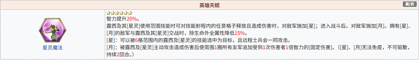 行动结束时恢复自身周围2格范围内所有其它友军的生命,恢复量为自身智力的1.5倍,远古树精在场时,茉的技能射程+1。