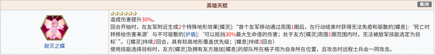 36.蝴姆巴巴[天赋加射程],可第一回合启动,需要队友,使用技能选择目标时,友方[蝶灵]及拥有友方施加[蝶息]的部队所在格子视为自身所在位置,某种意义上,最大射程无限,有断档风险。