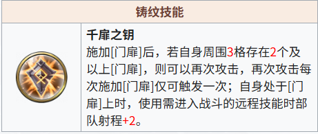 18.亚德凯摩[天赋加射程,铸纹技能加射程],需暖机,存在友方门扉时,可4格(“门扉”会增减),会断档,有断档风险(“门扉”被覆盖),有队友给再动,可不断档,6星后可不依赖队友实现射程提升不断档。开铸纹技能后,可第一回合启动,最大射程可6格(在“门扉”上使用需要进入战斗的远程技能),仍有断档风险。