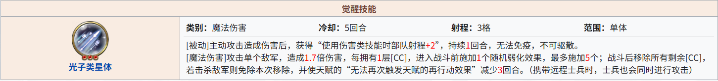 9.降生之光[天赋加射程],需暖机,3C技能可加速暖机;威光大于或等于2,可3格,威光大于或等于4,可4格;不带专属,6星可4格,带专属,4星可4格(“威光”不会减少)。