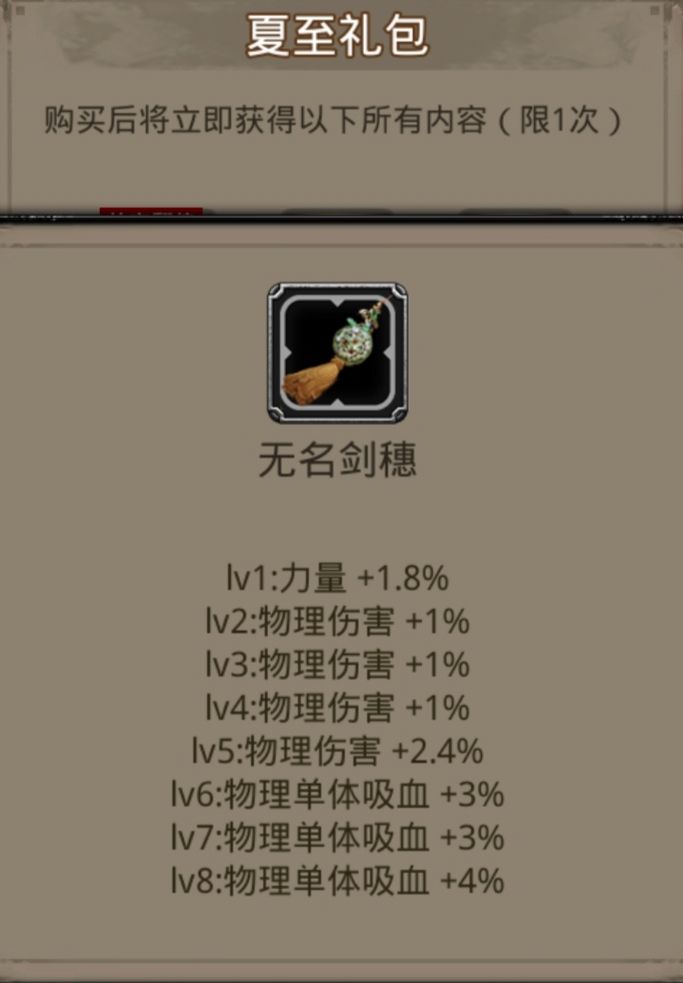 下面主要说一下无名剑穂——1.8力量+5.4物理伤害+10%物理单吸。