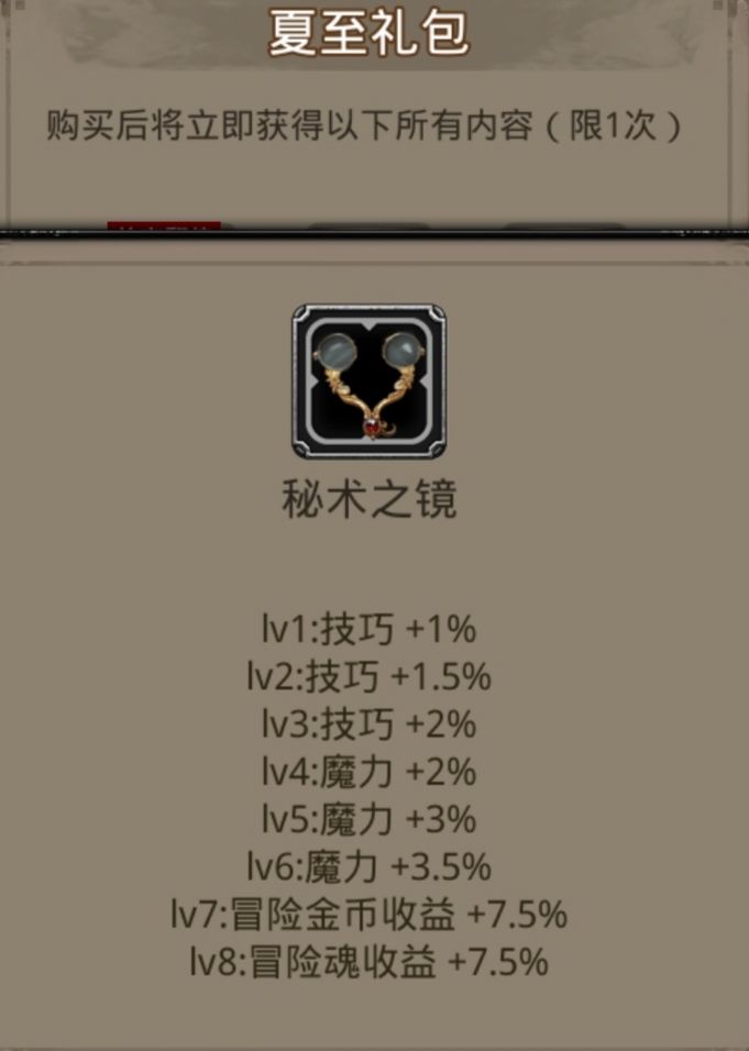 哦对,差点忘了,还有个秘术之镜,这个就没什么好说的了,确实比较拉垮,技巧太低很难给祭司之类常驻使用,副属性是魔力也不能给巫医使用,可以前中期给祭祀过渡一下,唯一值得称道的就是双冒险了,没有凑齐八个双冒险的玩家可以酌情考虑是否入手。
