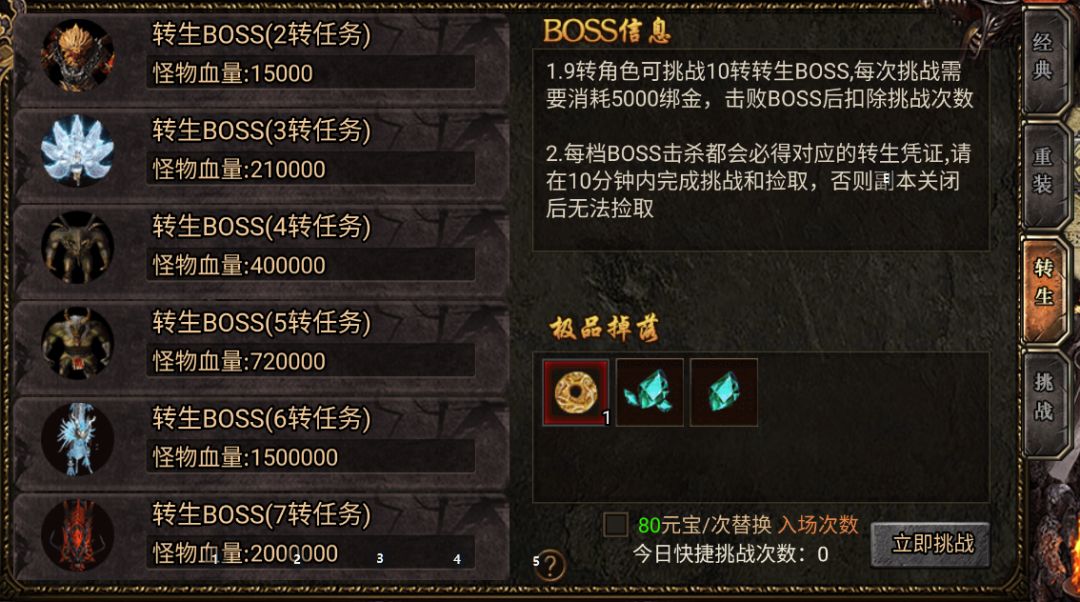 另外转生需要转生证明和曜石,魂火。曜石和魂火可以在野外爆出,证明需要在挑战BOSS里面的转生boss按照等级击杀。