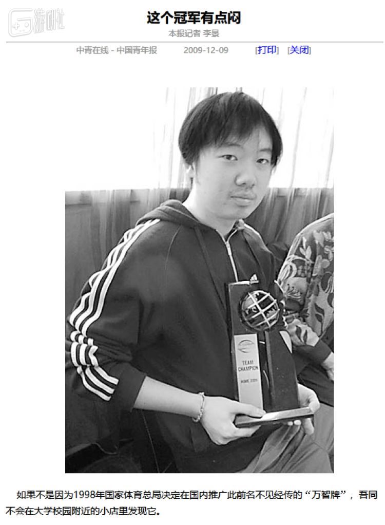 中国青年报曾在当年刊载了一篇题为“这个冠军有点闷”的报道,介绍了当时代表队中的牌手吾同。开篇第一句话就是:如果不是因为国家体育总局推广《万智牌》,“吾同不会在