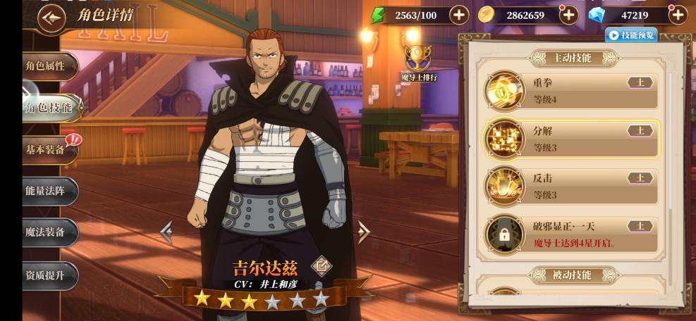 妖尾里以最强为名的超强魔导士,被行会里所有人称之为老爹的人物,他所使用的魔法“粉碎”,超上级破坏魔法。因为有意无意中将身边的建筑物破坏的毛病,因此玛格诺利亚的主街道专门为吉尔达斯而改造。在手游中吉尔达兹依旧非常强势,双拳既是他的武器,属于力量型-魔法攻击,初始三技能附带土元素属性: