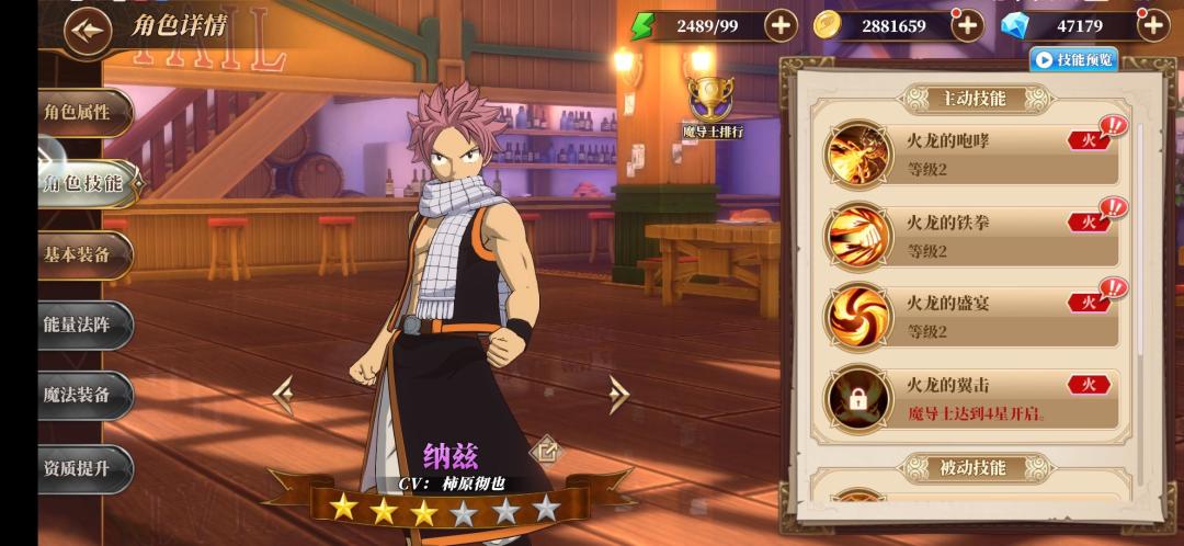 纳兹是一位力量型物理攻击手,火技能属性完美还原了动漫,人称“火龙”,是使用火之灭龙魔法的魔导士。在手游中,纳兹是游戏初期就赠送的主角,初始三技能分别是: