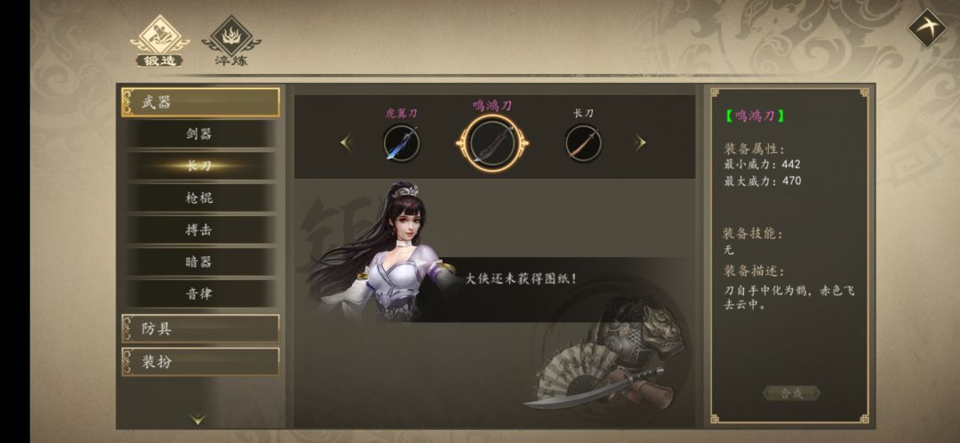 杭城打汪执的时候爆了鸣鸿刀图谱,使用后去铁匠那里发现依旧显示没有获得该图谱,我以为我记错了就又去行脚商那里买了一个,然后发现提示是已经拥有该图谱,那么问题来了,我是有还是没有呢