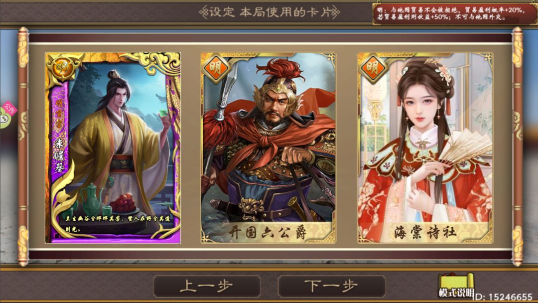 开局没有剧情,那就直接上朝,大佬随意玩及使用策卡。萌新的话,看一下礼部索要系统,看一下别国势力有没有5星以上的画作,判断方法就是看一下能用多少索要值换,1星画作20点,5星为100点,必须是画作才行,什么兵书还有别的是不行的(例如:清明上河图、虞美人、XXXX图、XXX画之类的等)没有这些的,请重开。有筑台望母的要优先使用,退朝后先去刷道德。下回合使用工商食官制,礼部调整时间为贸易1回合,这个不是用来挣钱的,是去送钱搞外交关系的,提高外交关系能获取更多的索要值,为后边需要画作的本纪做准备。