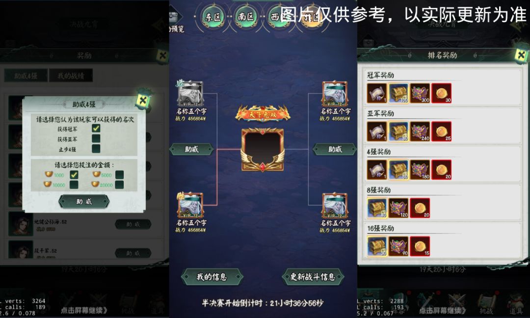 2.32强开始前可以助威4强,玩家可以任意选择成功晋级的玩家进行助威4强,助威成功 (例如助威玩家A为冠军,决赛后玩家A成为冠军则算助威成功若不为冠军则助威失败) 后可获得双倍助威消耗的奖励,助威失败则没有奖励,消耗不返还。32强开始后每轮晋级赛均可以助威,助威消耗一定量铜币,助威胜利获得积分(32进16:2分,16进8:4分,8进4:8分,半决赛:12分,决赛:20分),失败不获得。可助威自己