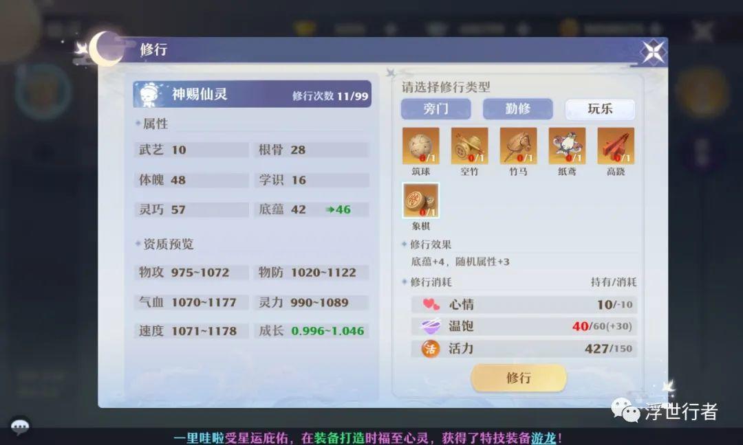 消耗心情40,温饱10,活力150,修行可以增加6点选中属性,增加1点随机属性。