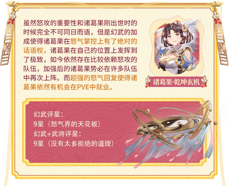 2、武将现状诸葛果至今仍然是最强大的怒气循环组件,但是碍于怒气系统的逐渐边缘化,诸葛果的地位也大不如前,即使在最需要怒气循环中的女团队伍中也鲜能见到诸葛果出场。虽然她在怒气领域有强大的统治力,但是过于单一的作用让她的综合功能无法再跟上时代。