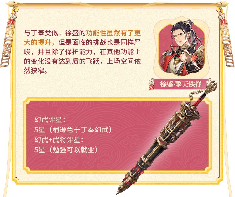在发挥徐盛长处的同时,幻武也给徐盛增加了增伤辅助,遗憾的是,“灼烧伤害提升”属性已经呈现出了比较严重的边际效应,实际的收益可能远不如纸面上那么好看,伤害的提升性一般,更重要的是还有“疑城”叠满的前置条件,综合效率没有特别高。