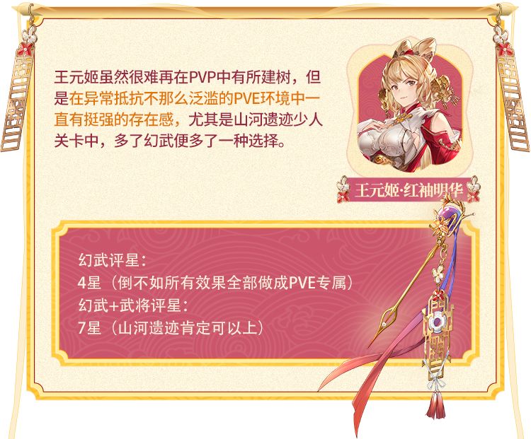 此技能明显是有意更改王元姬的定位,让其在PVE(主要是山河遗迹)中更加如鱼得水,让小将军在面对困难关卡时有更多选择。