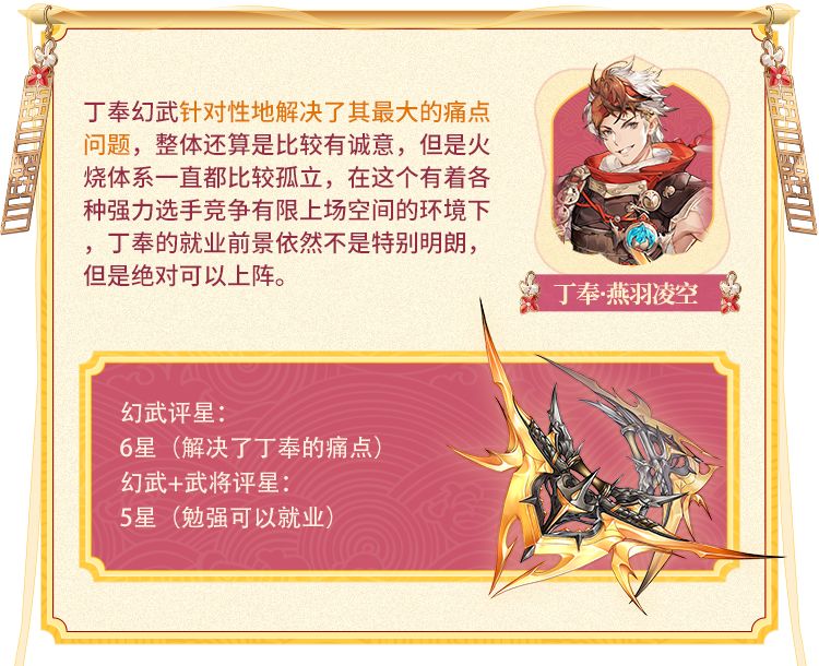 小将军们好~新一批专属幻武上线后,玩家@幼崽做了技能解读和武将分析,并且对幻武做了星级评价,希望能对大家有所助益~