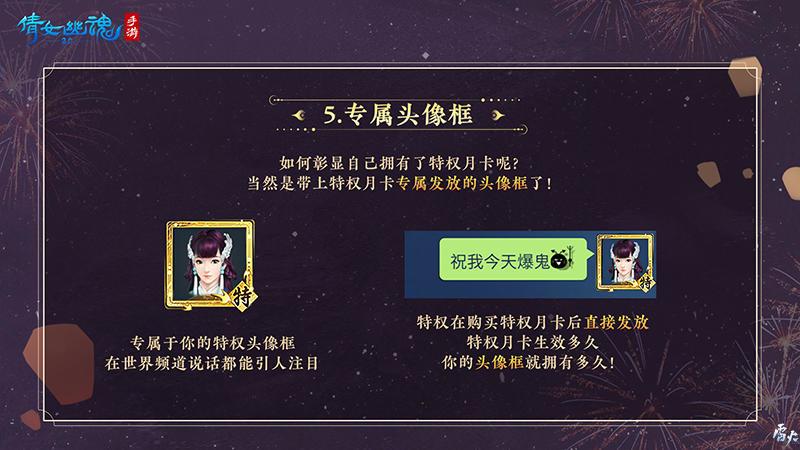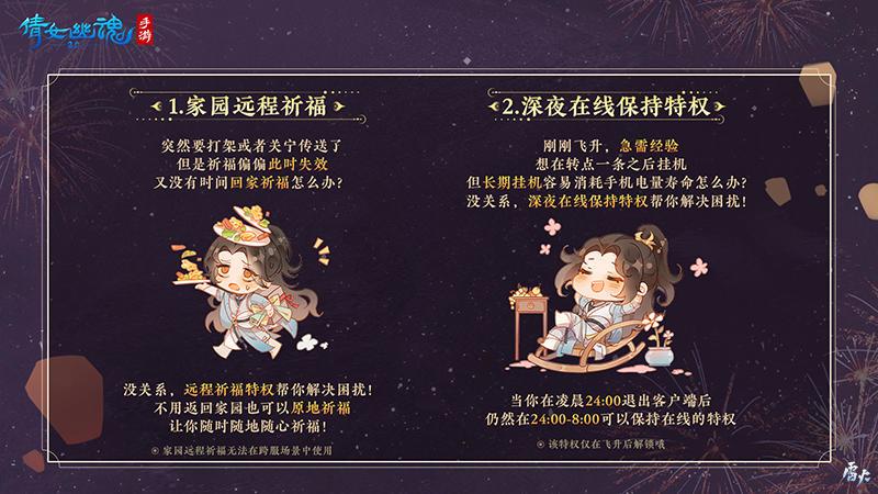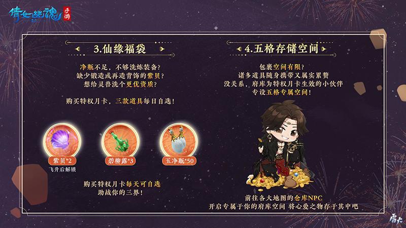 特权月卡生效期间,玩家更可畅享多种特权!家园远程祈福,可随时随地随心祈福!深夜在线保持特权,玩家凌晨24:00退出客户端后,在24:00-8:00可保持在线特权(此特权仅在飞升后解锁)!紫贝、碧柳露、玉净瓶三款道具每日自选!专设五格存储空间,快前往各大地图的仓库NPC开启专属于你的库府空间!