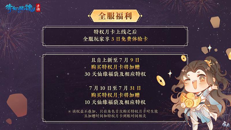 与此同时更有全服福利,免费体验机会等你体验!特权月卡上线之后,全服玩家可享3日免费体验卡!且自6月19日上新至7月9日,购买特权月卡将加赠30天仙缘福袋及相应特权;7月10日至7月31日,玩家购买特权月卡更将加赠10天仙缘福袋及相应特权!