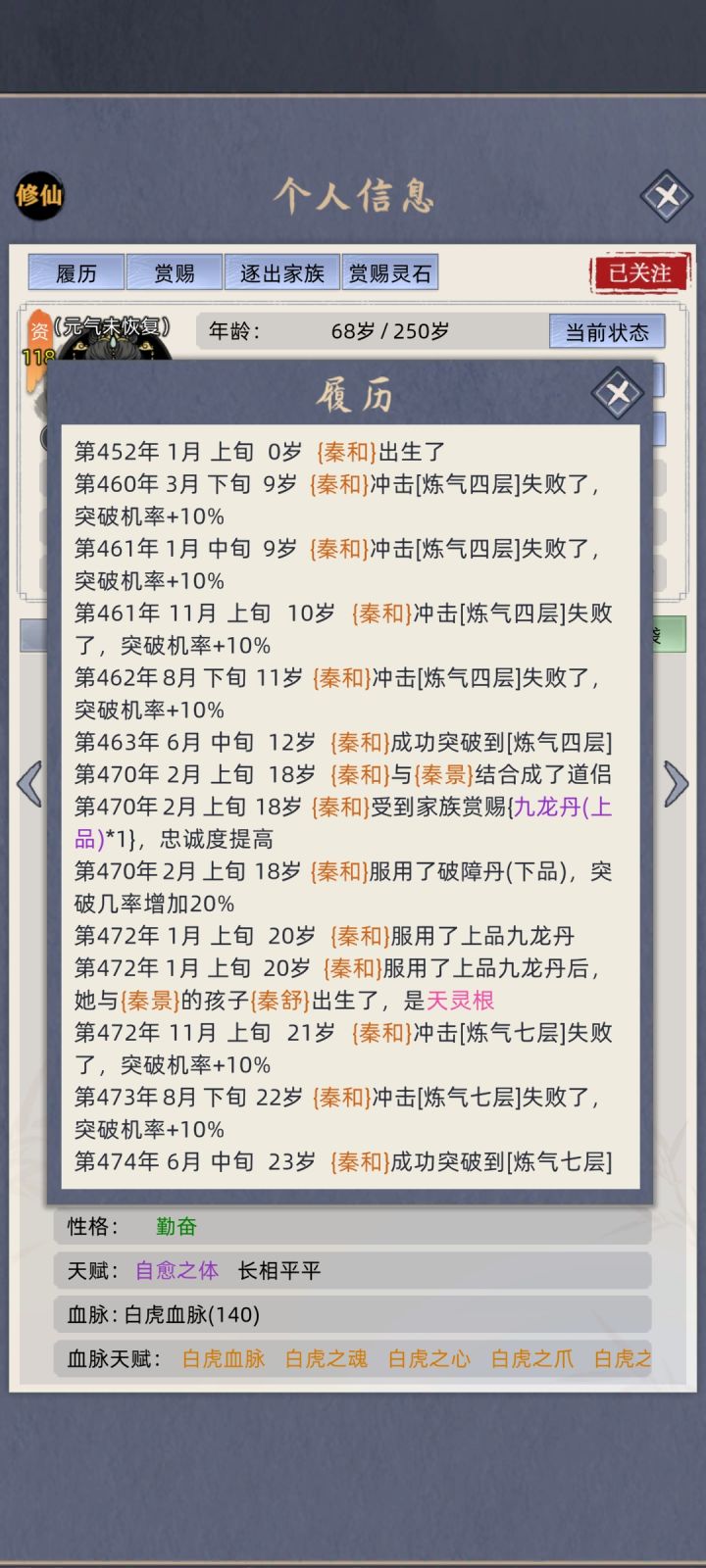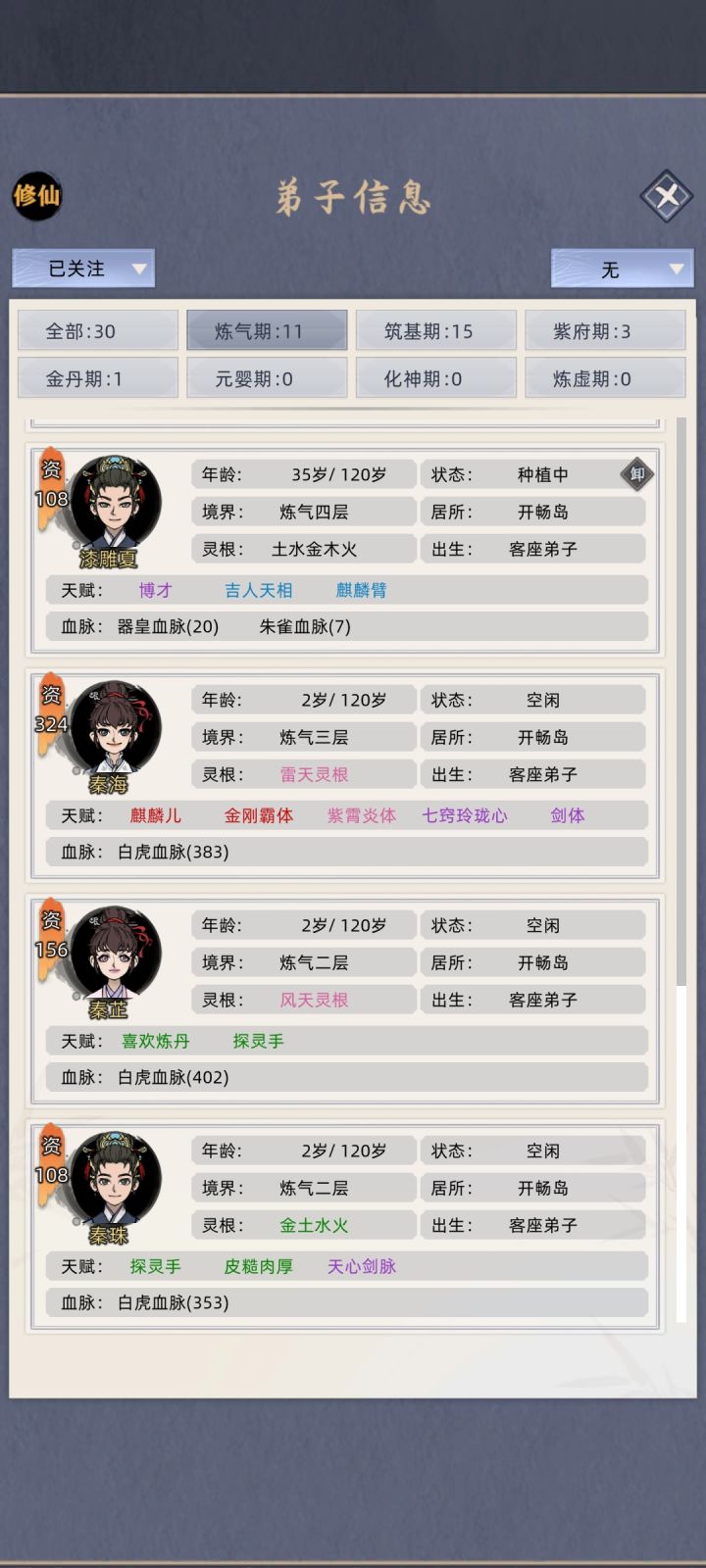 5.5版本出了个招募弟子可以看到血脉浓度,配对就很好配了,招募那里直接把资质拉到140这样自动拒绝关,低于20血脉浓度的直接拒绝,20的两两配对然后看运气运气好可以直接生出个50多血脉浓度的弟子差的也就算稀薄,慢慢配基本400年就可以把血脉浓度拉到一百多,经量把血脉浓度养到200稳传。五血脉我就懒得配了,一个血脉配好就够用了