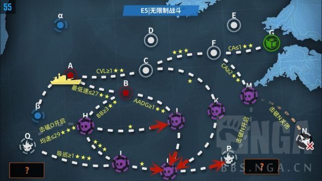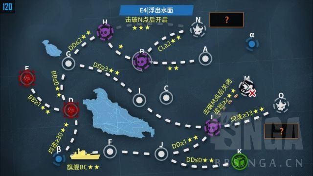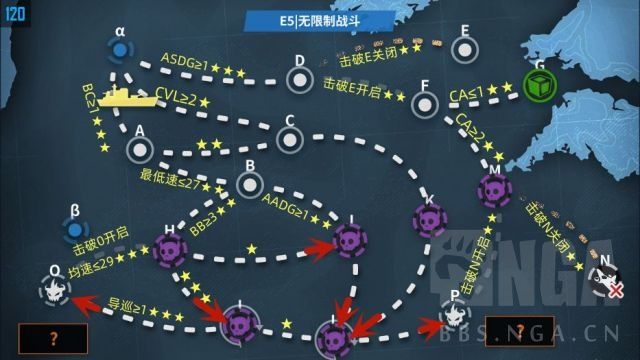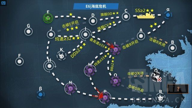 功勋:N:携带5C国,S胜。α进,路线A-I(迂回)-G(迂回)-H(削弱且迂回)-N。轻巡≤1,均速≤30