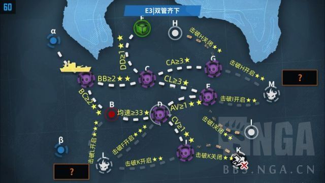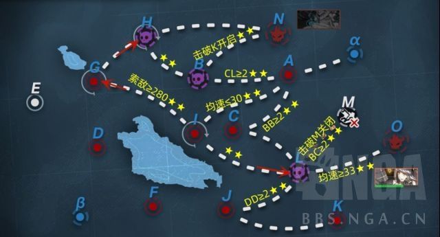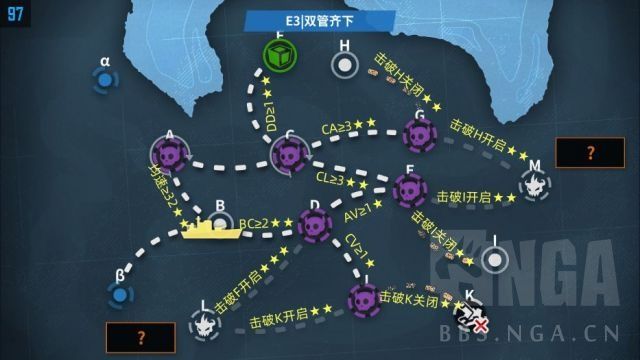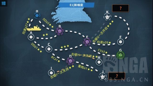 K:路线一:α进,路线B-D-G(削弱)-K。不带轻巡,潜艇≥2,均速≤31。大冒险,出门sl到B点后就是直达