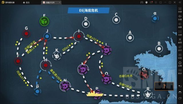 O点是支援点,可以在院长点补不少伤害,α进,路线A-L-O-Q。潜艇≤1,均速<33。推荐2战列+开幕队洗过去。