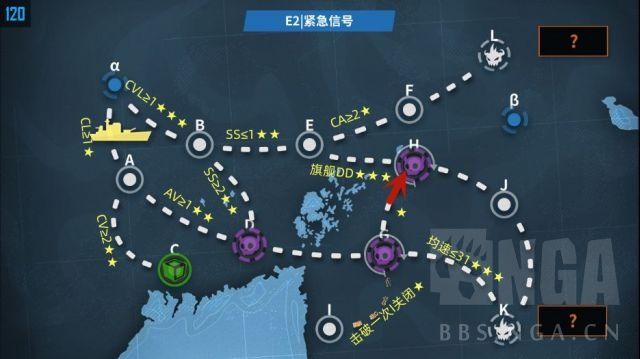 宝箱:α进,路线D-F-G。均速<30,不带战巡,轻巡≤1,重巡≤1。带个有导驱的洗地队可直达