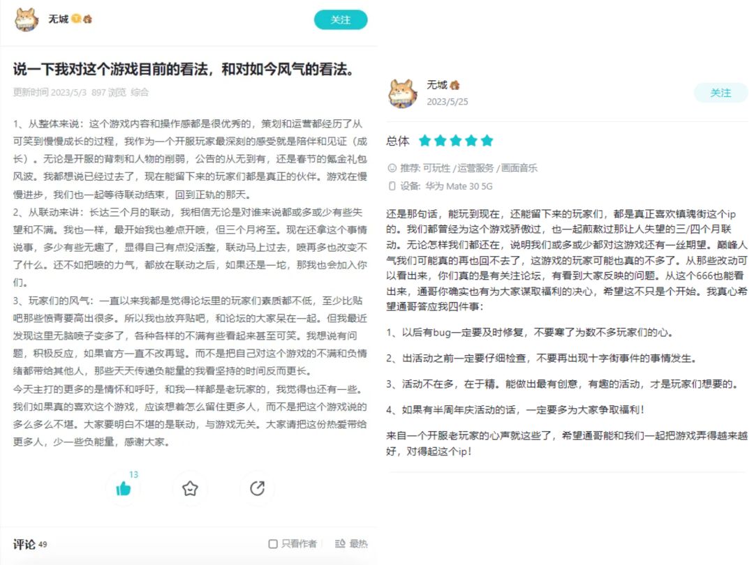 以上是新版本内容答疑部分,还有第四点,就是镇魂将给我们提的建议,我印象最深的是镇魂将【无城】,每次发言都非常中肯,并且字里行间都能体现是真的很希望游戏越做越好!非常感谢镇魂将【无城】,至于说福利,6月新版本后,社区的福利礼包会增加,大家可以多留意~