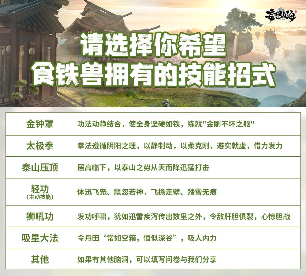 旅者们快去为未来的进化兽选择想要的设定吧!如果有更多相关脑洞,也可以填进问卷哦~你们的一切创意与脑洞,都是我们的宝藏,山海永远包容旅者们的一切“妄想”!