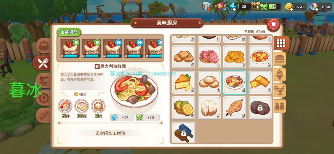 意大利海鲜面【等级】,制作时长40分,配方:鱼肉×3,海螺×3,面粉×2,回复:+17,+20