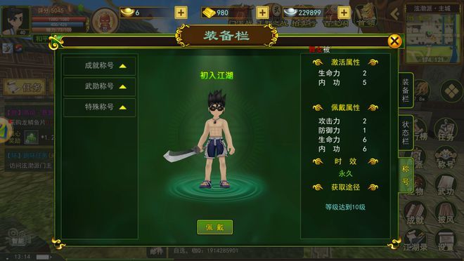 成就称号:初入江湖:等级达到10级成群结队:拥有10个好友