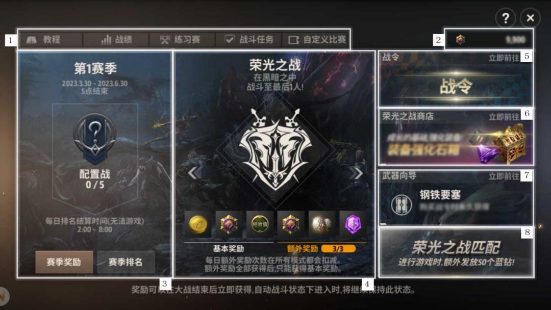 荣光之战的交互界面展示了大量地图中的信息,这些信息可以为幸存者调整配装、技能和移动路线提供有效的参考。(1) 可查看当前自己停留的防区位置和该区域关闭的时间。(2) 可查看自己当前的等级与剩下体力、武器等级。(3) 可查看自己目前的成绩和当前剩下的玩家数。(4) 可查看当前自己获得与穿戴的装备和道具。(5) 可查看当前自己装备中的道具信息,与装备中的技能信息。(6) 可查看自己的武器等级。普通攻击按键的下方强化数字为自己的武器等级。消灭地图中的所有魔物,可以获得[武器强化石],[武器强化石]可提升武器等级。当武器等级提升时,还可以学习新的技能或升级技能。除此之外,消灭其他玩家也可以提升武器等级!(7) 每当提升武器等级,会显示可选择的技能目录,可学习的技能每场会随机更动,最多可学习4个。4个全部学习以后,武器升级时可以进行武器技能强化。