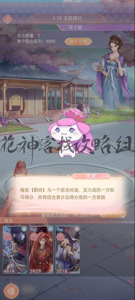 我们将通过羁绊卡和花十娘的恶念进行对战,由于我们的羁绊卡数值更高,而且数量比花十娘多一张,因此这关基本就是白给的,轻松取胜。