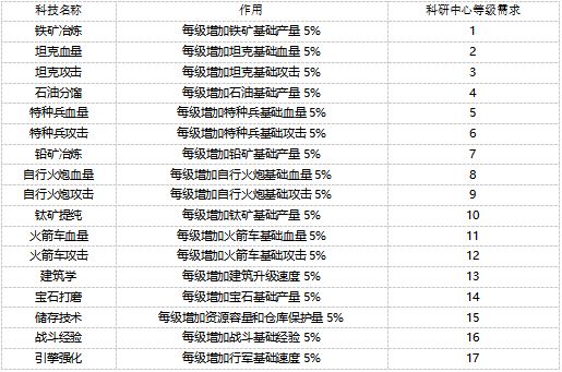1、目前游戏中有17种科技,它们分别包括5种资源产量、8种兵种战斗属性、行军速度、建筑建造时间、资源保护量以及战斗经验加成。只需要使用5种资源即可将这些科技进行升级。
